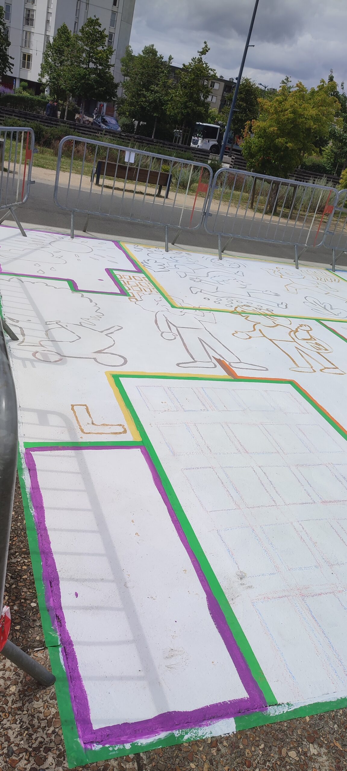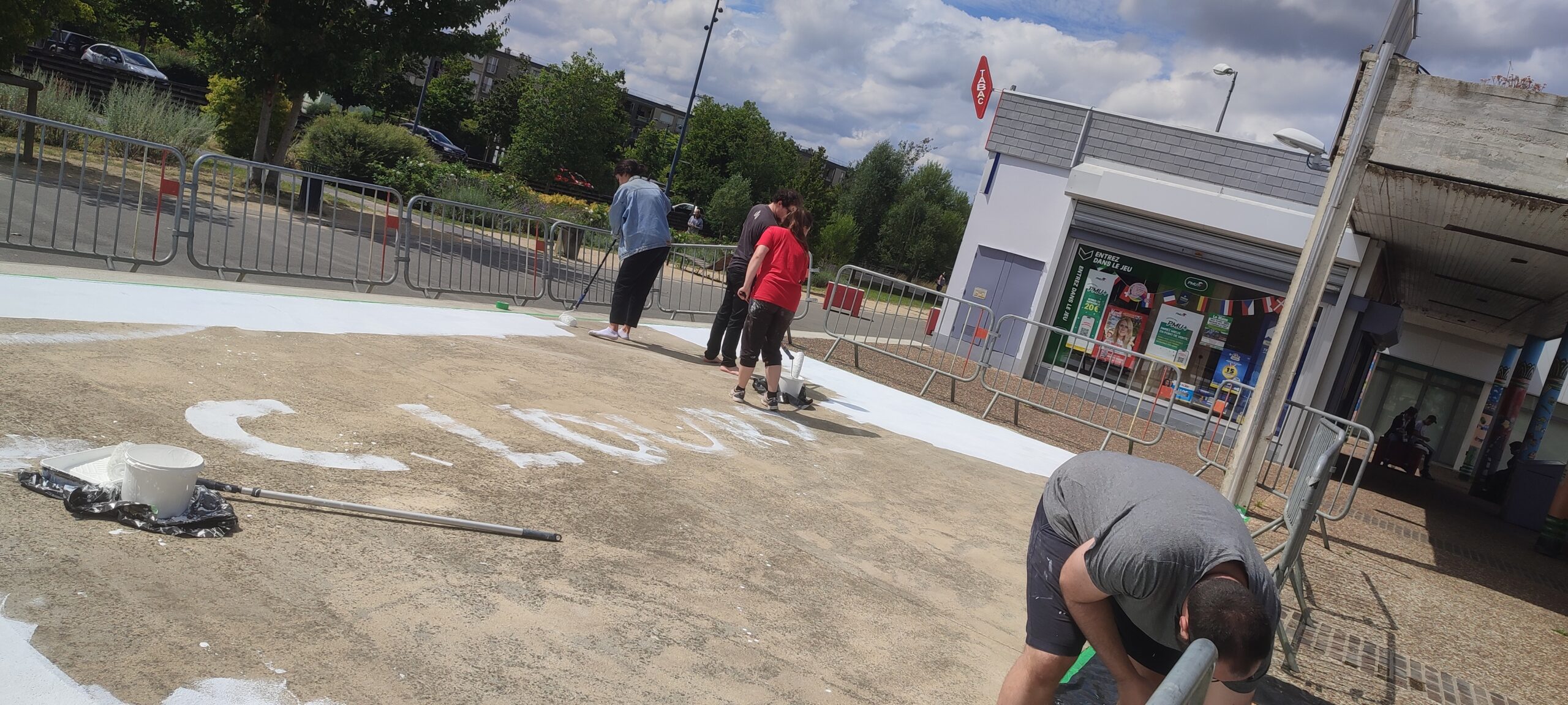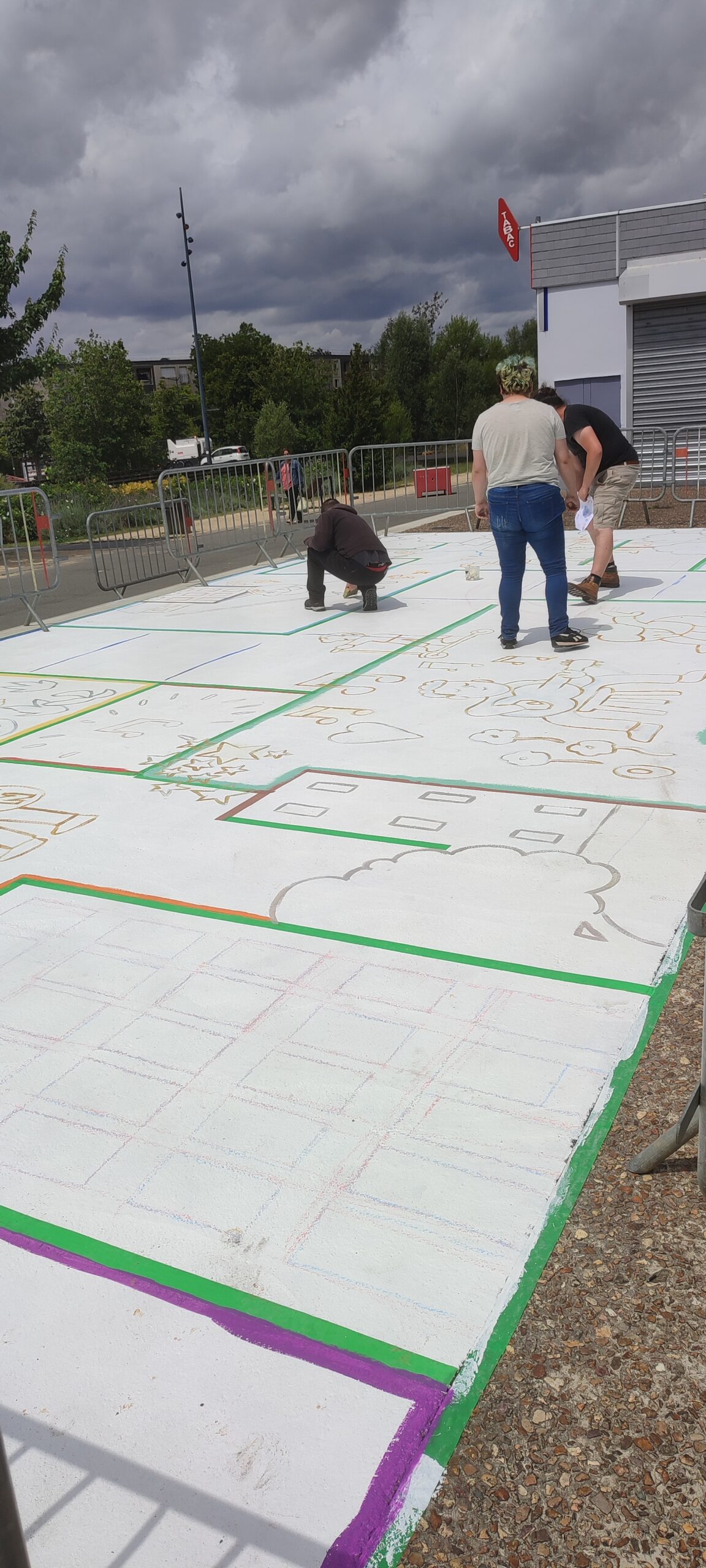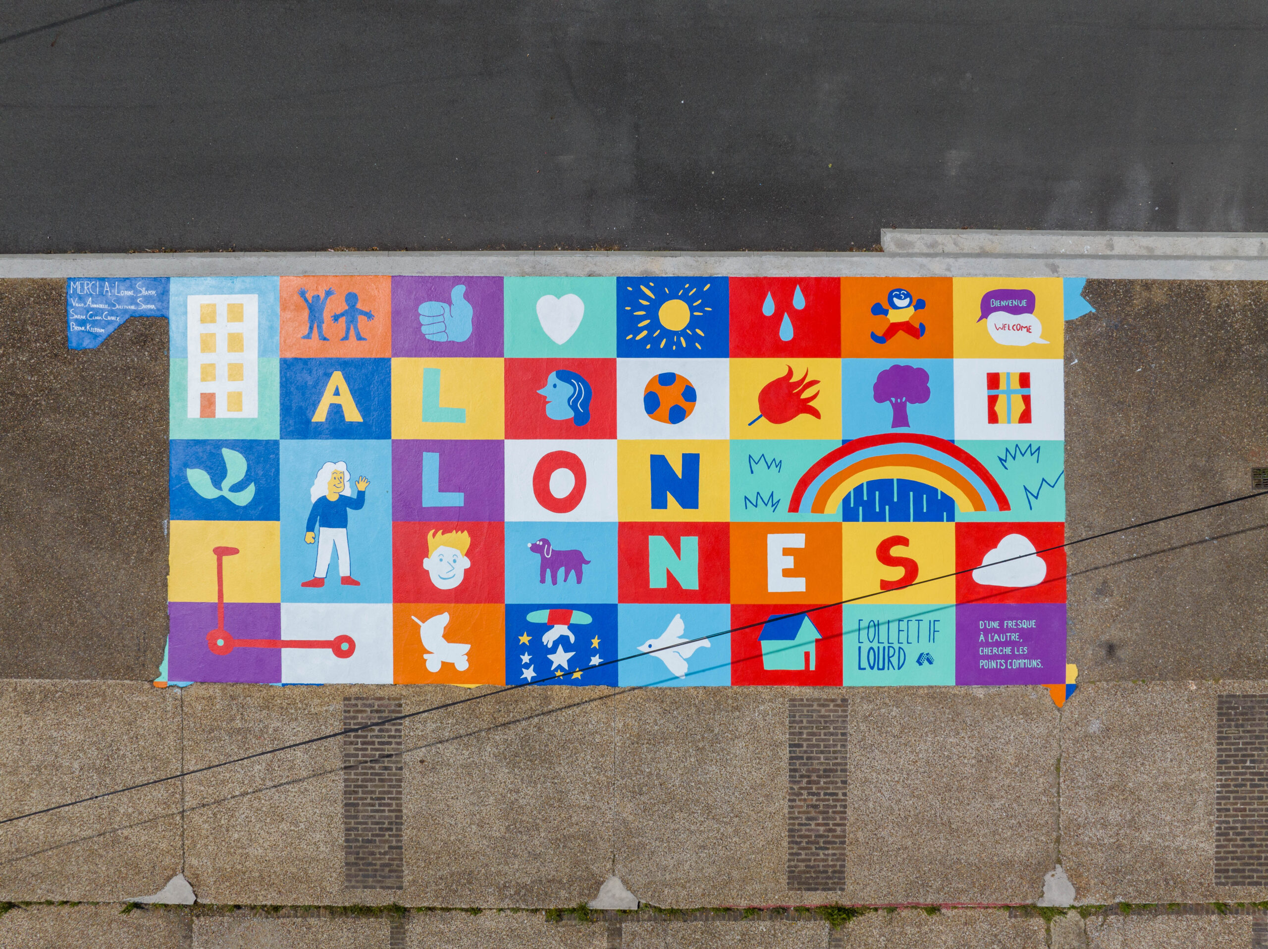 Il nous a fallu trois semaines pour créer cette double fresque, affrontant les intempéries et le soleil dans une chouette ambiance, avec l’aide des habitants d’Allonnes, de nos amis bénévoles, et de Max, notre stagiaire.