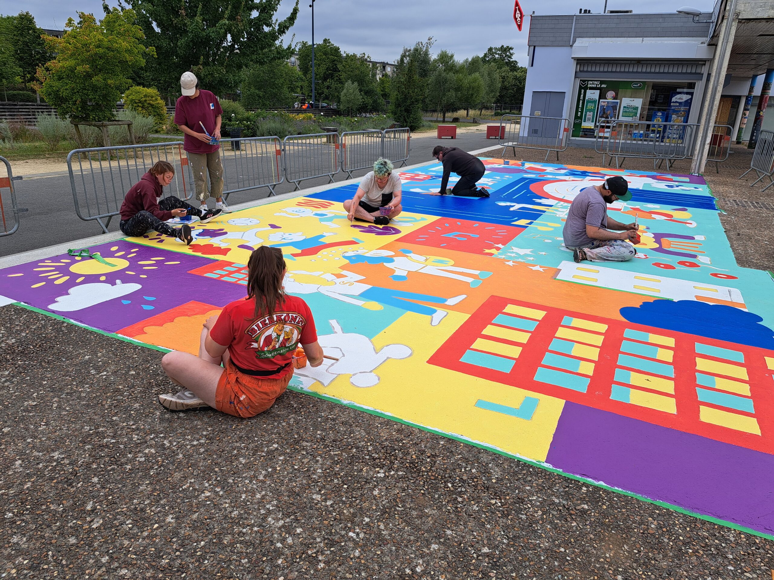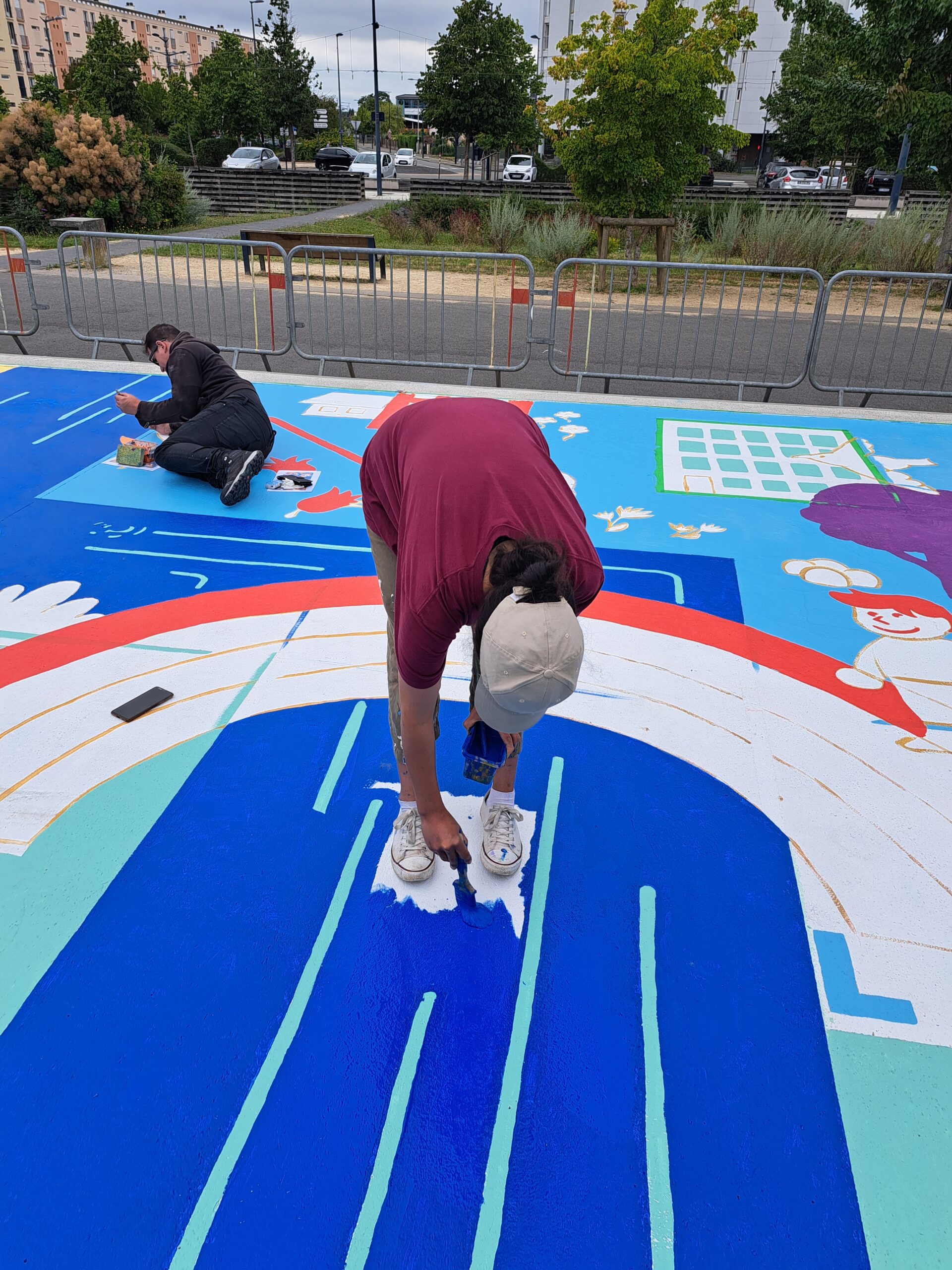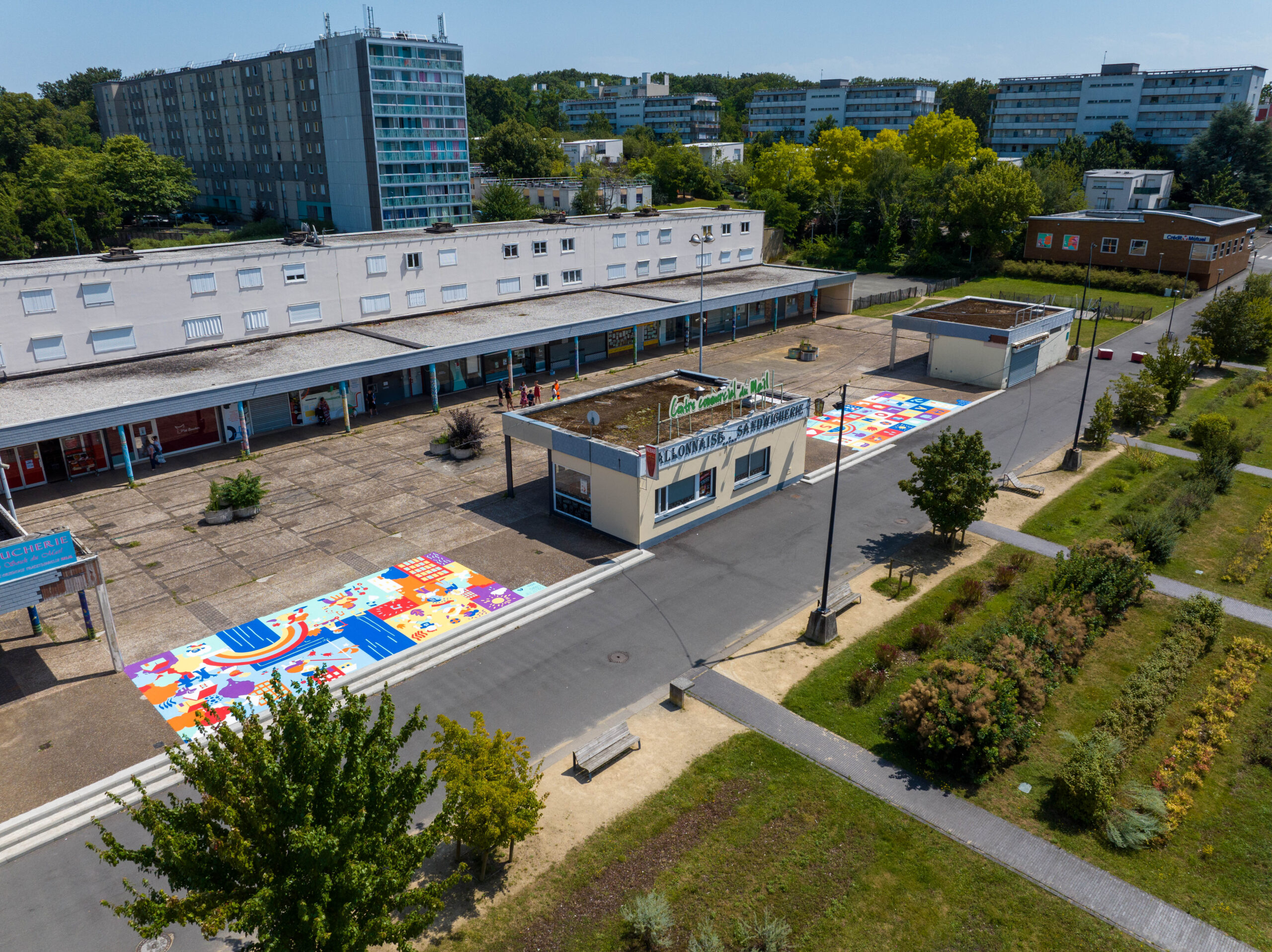 Deux fresques au sol de 60m2 chacune, Place du Mail, Allonnes Photos : Air2d3, Xavier Sarrat et Lila Robert pour Cenovia Cités